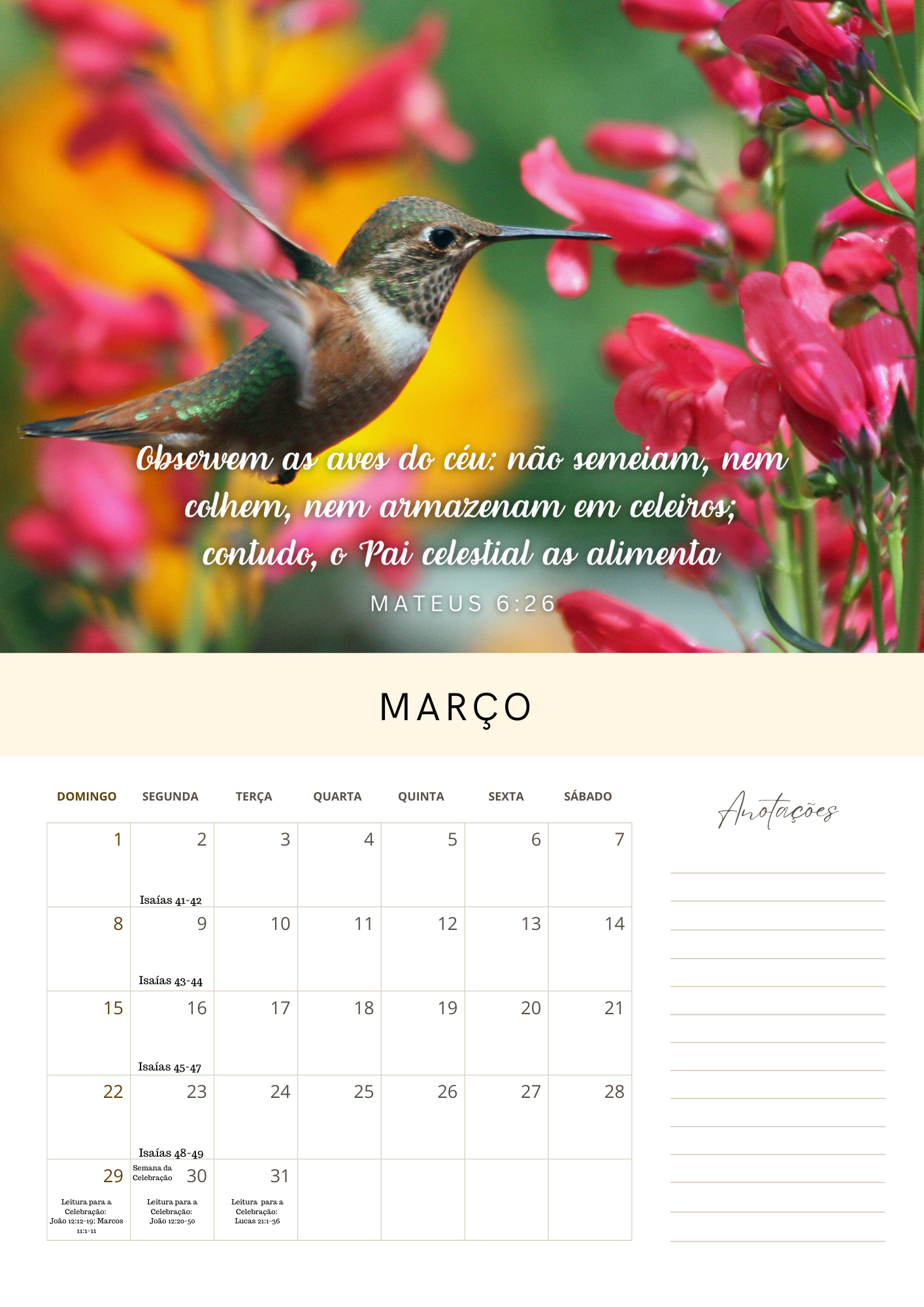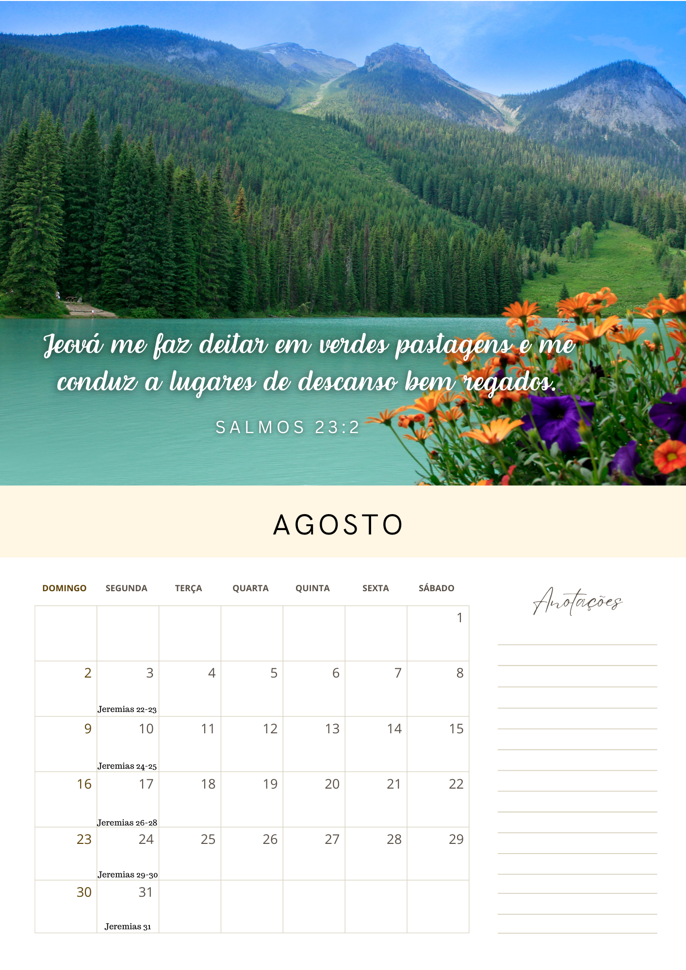 Facilite a sua rotina com o Calendário de Parede 1 mês por página – Arquivo Digital. Este produto é ideal para quem busca uma maneira prática e moderna de organizar suas atividades, eventos e compromissos do mês. Cada mês vem com a programação semanal de leitura da Bíblia, além da leitura da Bíblia para a Celebração. Com um design clean e funcional, este calendário é perfeito para imprimir e exibir na sua parede, garantindo acesso rápido às informações importantes. Cada página do calendário apresenta um mês completo e uma espaço pautado para anotações. Ao final, uma página dedicada para anotar telefones importantes. Adquira o Calendário de Parede 1 mês por página – Arquivo Digital e aproveite um método simples e eficiente de gerenciar seu tempo!