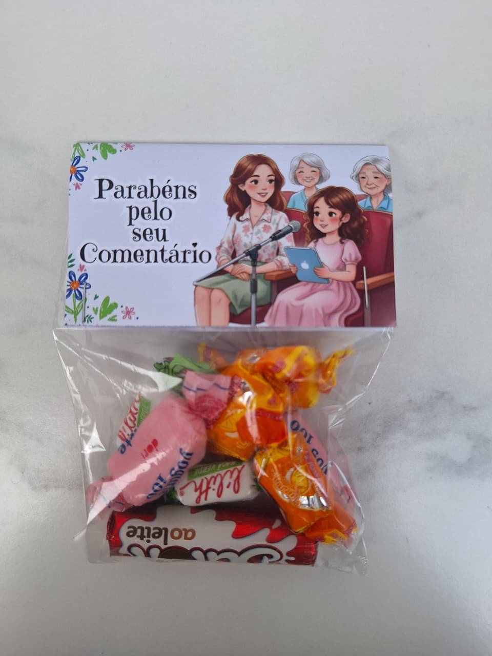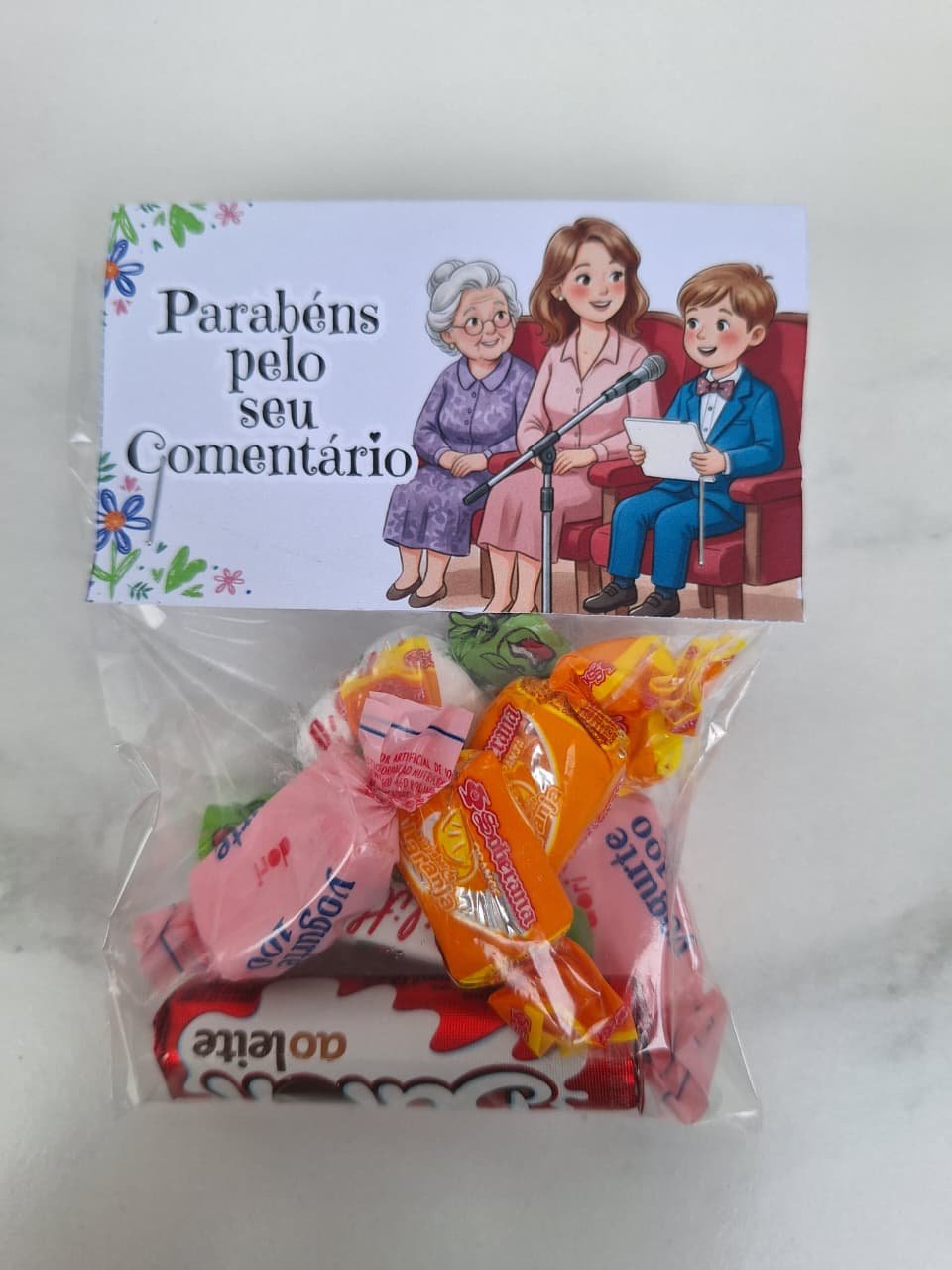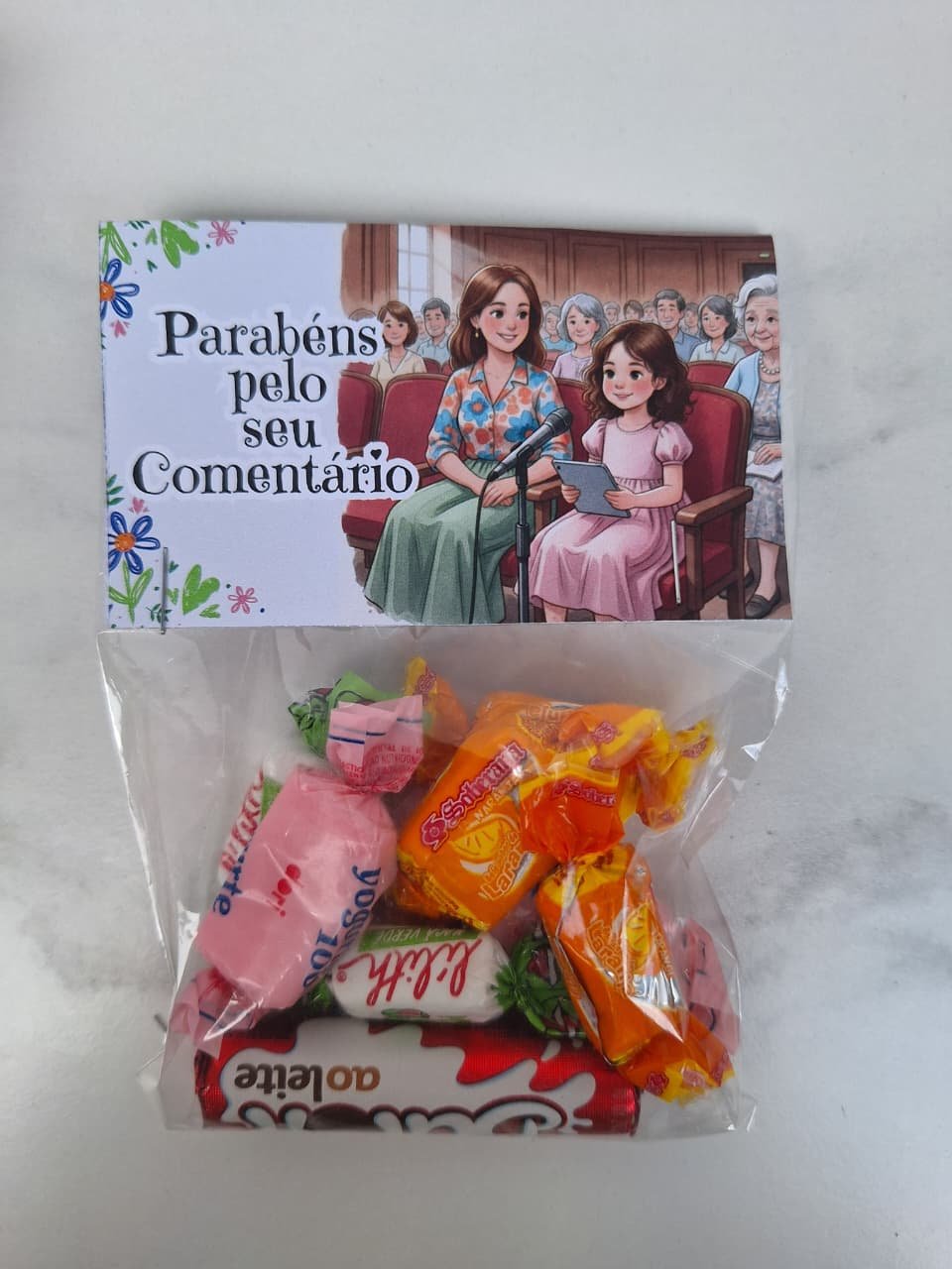 Incentive as crianças com essa linda tag de “Parabéns pelo seu comentário”. Basta uma pequena embalagem (10×15) e alguns doces para incrementar. As crianças vão amar e se sentirão valorizadas. Aproveite e garanta esse arquivo digital super fácil de imprimir e montar