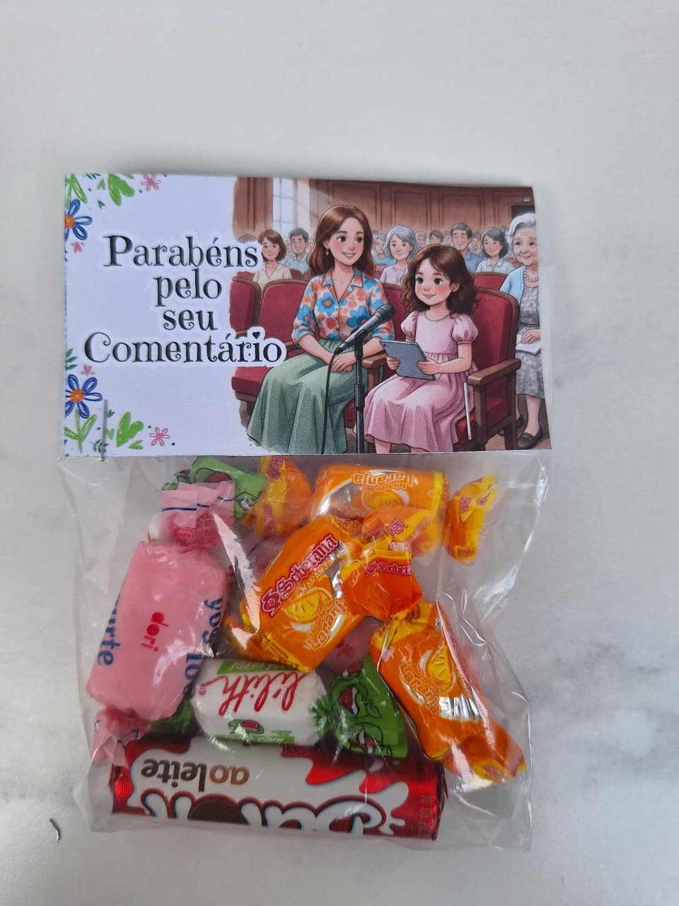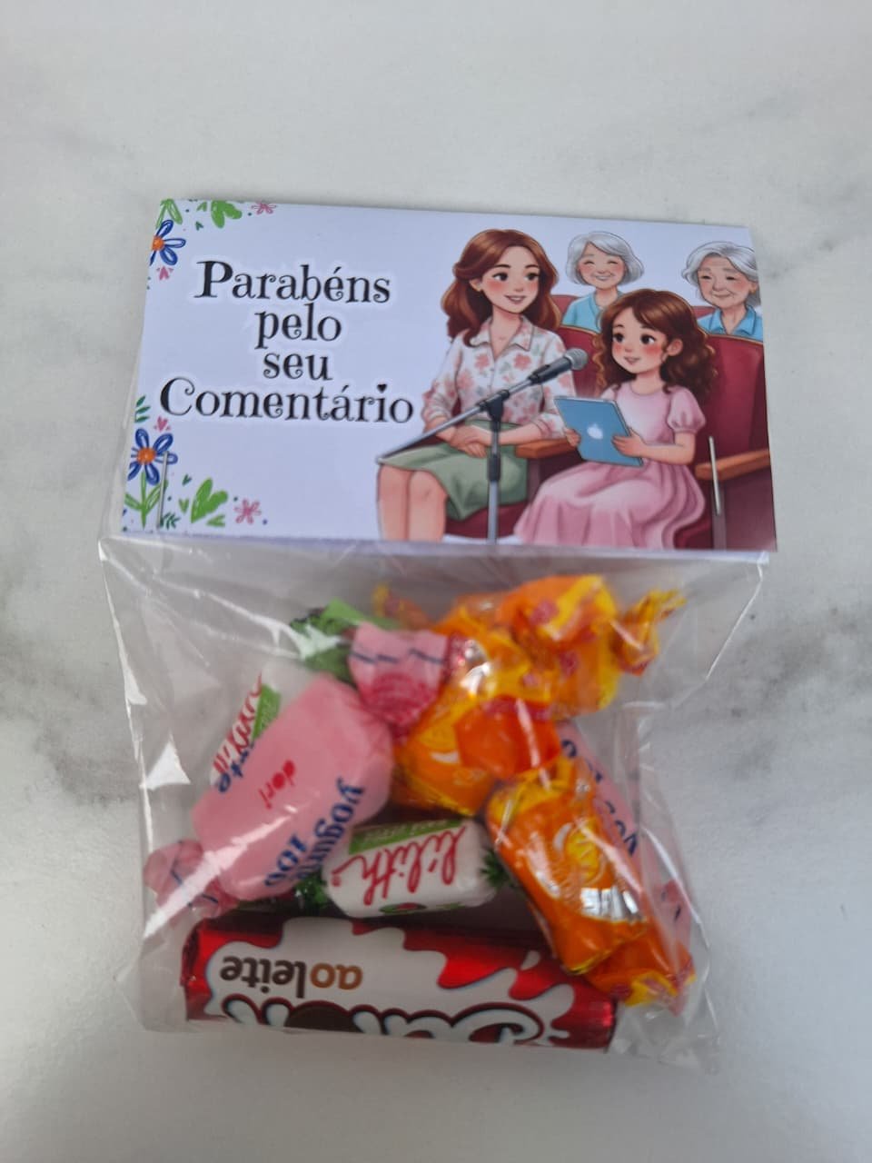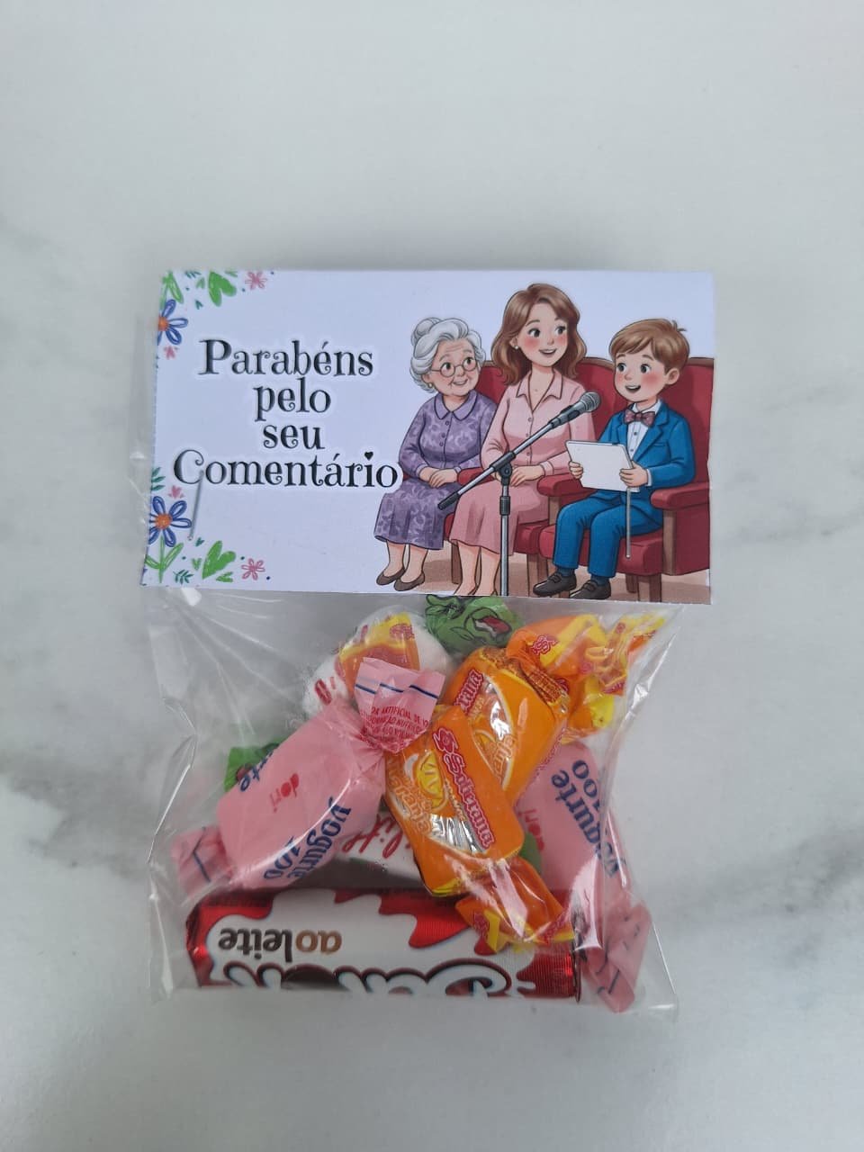Incentive as crianças com essa linda tag de “Parabéns pelo seu comentário”. Basta uma pequena embalagem (10×15) e alguns doces para incrementar. As crianças vão amar e se sentirão valorizadas. Aproveite e garanta esse arquivo digital super fácil de imprimir e montar